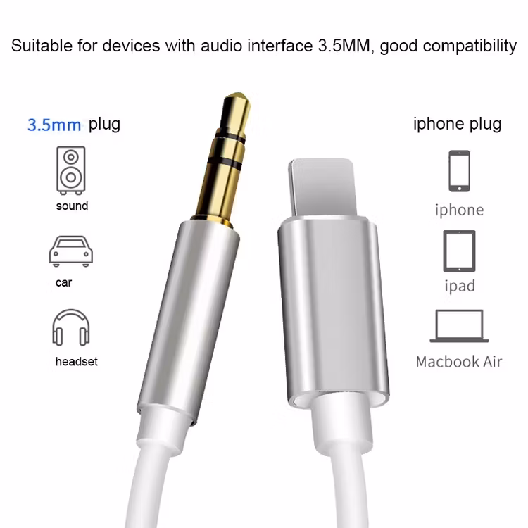 Med den här adapterkabel kan du koppla in dina Apple-enheter till ett 3.5mm-uttag med Apple Lightning.